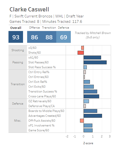 Caswell is also very shifty, and is able to stickhandle with the puck at a pretty high level in order to buy himself more time (if needed) before making his pass. He has a very high rate of passes into dangerous areas of the ice as well, which is a big reason why he was able to earn so many assists on a not-so-great offensive team.