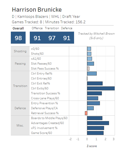 Brunicke's point production is nice, especially since he was on an awful team, but the other thing to note is that he was not their top PP defenseman. He seemed to be their second unit guy, where he had only four points come with the man advantage. If you rate out his even-strength point-per-game rate, he is right behind the best point production U18 defensemen in the WHL. Next year, with their main PP guy this year aging out of junior, there's a very good chance that Brunicke inherits that role and could have a big offensive explosion in point production. This is basically the exact same thing that happened with Noah Chadwick from last season to this one.