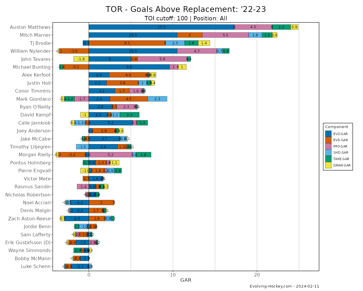 Now let's jump down the list to the very next defender. He's eighth. And his entire claim to fame – and really someone should write about this – is his orange defence. He's a negative value offensively, and this means all offensive creation, not his personal shot. And his current season its own article, but as much as Liljegren has been a very big contributor to transition and puck movement, we know what he can't do, and so does Sheldon Keefe.
