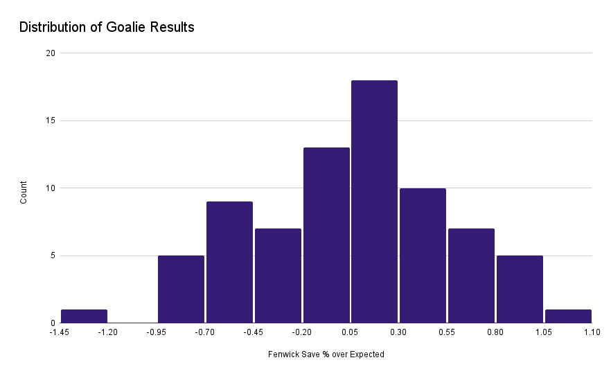 Delta Save % or Fenwick over Expected is what I usually focus on now that the Leafs are not a terrible team for allowing shots. They don't need a goalie who can start 50 games and face 50 a night. This is the distribution of just the Delta measure:
