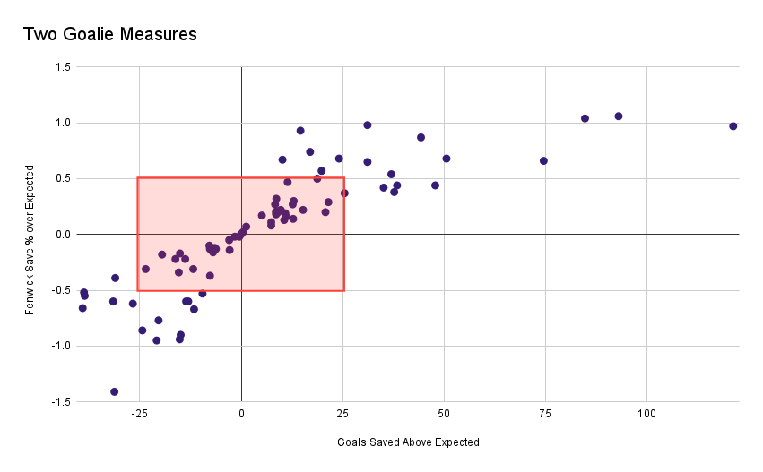 Clearly they are strongly related, but at the top end you see those four lonely souls out by themselves. That's big workload goalies, the ones who start more games than they should and whose teams let them face a lot of shots. From right to left, they are Connor Hellebuyck, Igor Shesterkin, Ilya Sorokin and Juuse Saros.
