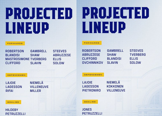 Only a handful of tweaks were made for the weekend, mostly to depth players to accommodate the tough schedule of three games in four days—the third game is tonight, more on that below—though there was the interesting swap of Tverberg and Blandisi.