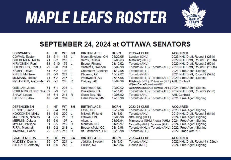 The Leafs team will be made up of this roster, which includes only one extra defender:
