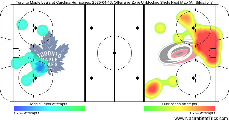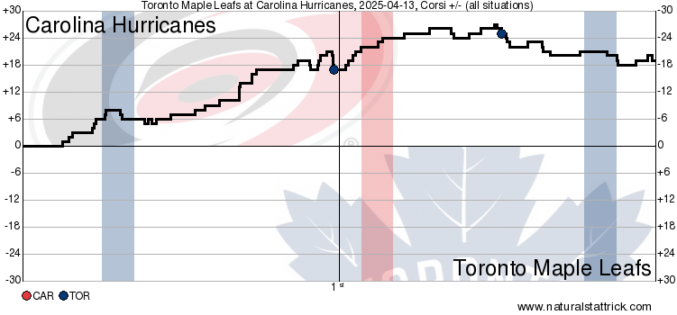 This period was dead even in Corsi, with the Hurricanes at 22% Expected Goals, a flip there almost exactly of the first period. The Leafs were better and tired, and the 'Canes were tired and coasting to the playoffs.
