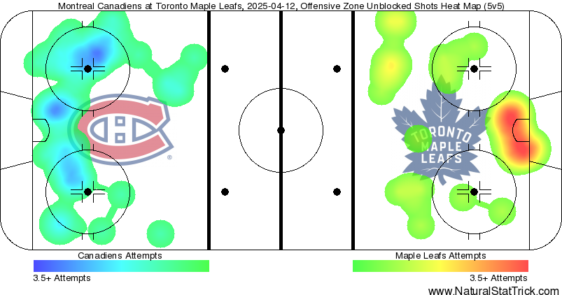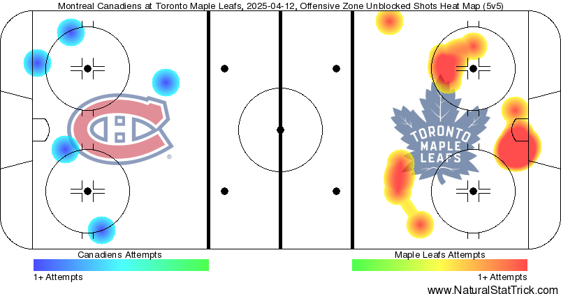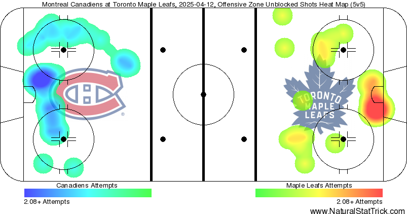 After one, it was zero-all. And Montréal finished that period with two Shots on Goal. At five-on-five, the Leafs had 58% Corsi as the Canadiens did shoot the puck, they just missed a lot.