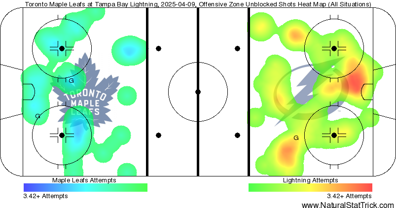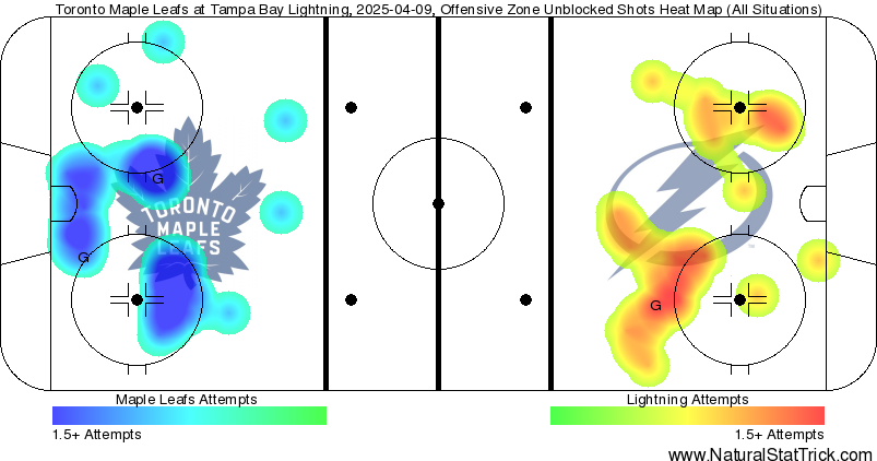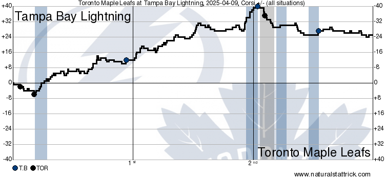 Five-on-five Corsi was 25-23 for the Lightning, but the Expected Goals were 1.26 to 0.92 for the Leafs. The Lightning were never near the net: