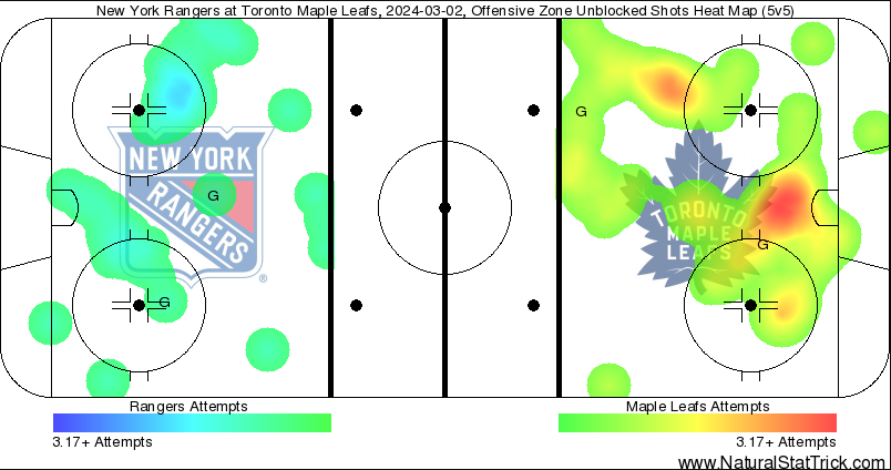 - Toronto played a very strong period. Even at the start when the underlying numbers favoured the Rangers, I thought the Leafs had some good chances that weren't 'counted' because they didn't result in a shot attempt/shot on net.