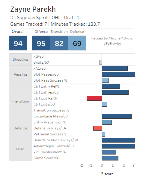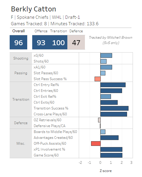 Maxim Massé – Massé is a 6'1" right winger playing for Chicoutimi in the QMJHL. He finished his D-1 season as a 16 year finishing second on his team with 62 points in 65 games, and first in the QMJHL in points by U17 players. His tracking data is very strong as far as overall offense, and specifically for generating shots and scoring chances for himself. His other tracking data for defense is okay, but his transitions are not great – though that may mainly be the team relying on his center/linemates to carry the puck into the offensive zone rather than a 16 year old rookie. He'll be one to follow this season who could be a first round pick.