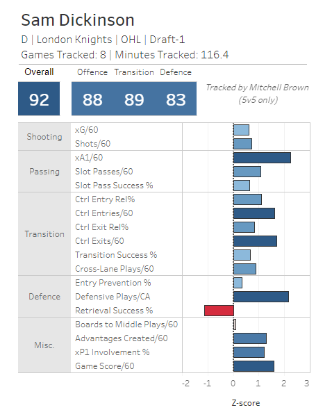 Sam Dickinson – a top OHL draft pick who forced a trade to the hated London Knights (spits), Dickinson is a 6'3" left shot defenseman with a June 2006 birthday. Playing behind older and NHL drafted prospects like Isaiah George and the Montreal Canadians first round draft pick with sex based crimes on his record, Dickinson finished with 23 points in 62 games, and another 8 points in 21 playoff games. And his tracking data as a 16 year defenseman looks excellent across the board. Playing on a top team, he'll have a chance to carve out a bigger role for himself and get more PP minutes where his point totals will likely spike.