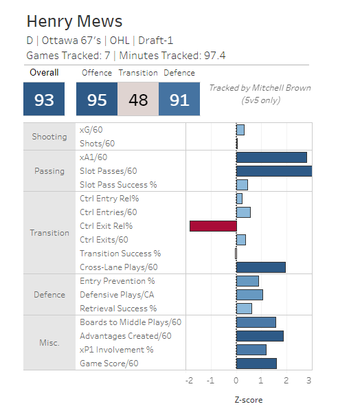 Henry Mews – Playing for one of the top OHL teams in Ottawa, Mews is a 6'0" right shot defenseman who finished with 31 points in 55 games. Like Dickinson, Mews has very strong tracking data almost across the board, and while he played a more limited role since Ottawa was pretty deep, he earned the time he got and will get more of a role this coming season. As of now, if he has a nice stepping stone season in his draft year I could see him ultimately going in the second half of the first round.