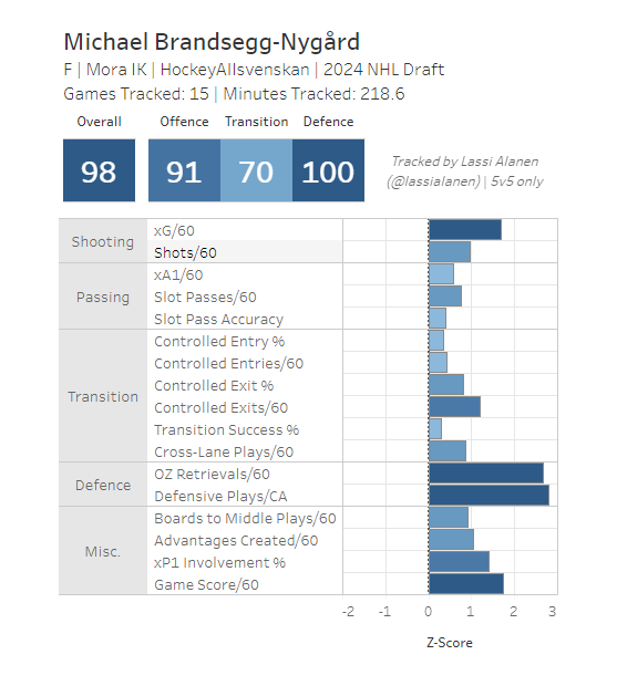 Brandsegg-Nygård is not necessarily dynamic in how he generates offense or finishes plays, but uses his ability to create chaos with speed and physical intensity as a means of generating chances for himself and teammates. He gets good ratings and reviews from scouts for his vision and – everyone's favourite term – 'hockey IQ' for how he solves problems under pressure. His passing is pretty simple but he can at least complete most of the passes he makes as a result.