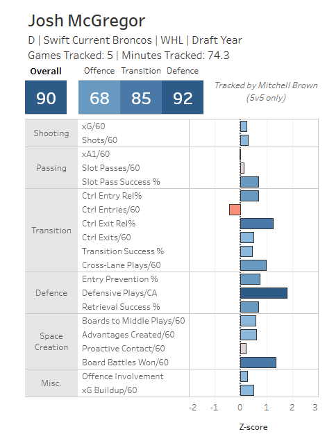 McGregor has been arguably my favourite sleeper prospect for most of this season. Part of it is that he's a nice story. He was undrafted to the WHL, earned a spot on Swift Current's roster out of pre-season this year, and has carved out a role for himself bouncing between their second and third pairings (and a couple of times on the top pair). He's tall but physically under-developed as of now, he's on the young side with a June birthday, and he has stellar tracking data despite being on a team in the bottom half of the standings. He just seems like a guy that could take a big leap next year, and I think there's some offensive skills to work with if they get nurtured and refined.
