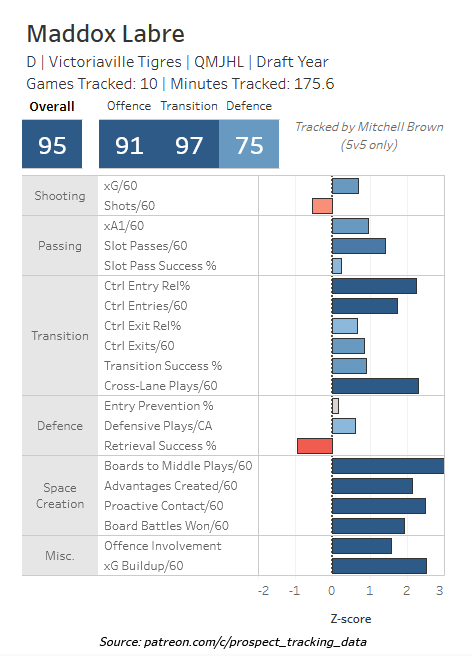 I promise, this will be the last of the "big defenseman without great offense that I think I could actually like if Toronto takes him" guy. Bondar is a Russian defenseman playing in the QMJHL, with solid defensive tracking data and decent transition data. I've seen some scouts opine that he has flashed high-end capabilities both offensively and defensively, though his execution of offensive plays are not consistent from what I've seen. The hope is that he just needs more practice to physically pull off the things his brain recognizes are useful plays to attempt.