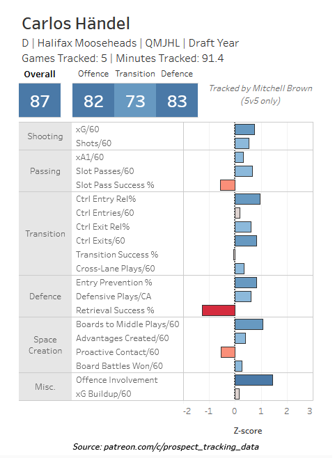Händel is not a very flashy defenseman, but he's very smooth and reliable. He eats minutes, and just does a lot of things well – not great, but well. He's a good skater, he is a smart defender, he moves the puck well out of his own end and through the neutral zone, he supports the offense by activating off the point or into a rush when the situation calls for it, all that stuff and more. There are not many areas where he is below average as of now, but scouts have identified his power (skating, physical play) and defensive retrievals as areas that need the most improvement. He's still pretty light and has room to grow a bit more physically, which will help with his skating, shooting and checking power.