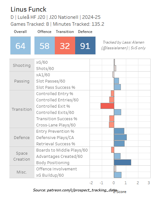 Dahlqvist is a toolsy defensive defenseman, with a mix of size, skating ability, and at least a foundation for being able to make quick and simple (but effective) passes up the ice to keep it moving. He is one of the more physical defensive defensemen I've profiled so far, if that's your kind of thing, but also shows good gap control and footwork to help him shut down his opponents. He had 12 points in 37 games in Sweden's junior league, then dressed in 16 pro games in the SHL. He's definitely a project for the long term, which is why I think he'll wind up being a later round pick.
