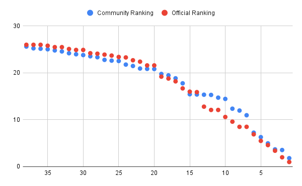And one final thing: In a comment I posted the chart of the Community Vote to show the tiers that were inherent in the vote. Here it is again, combined with the Official Vote, so you can see the big difference.