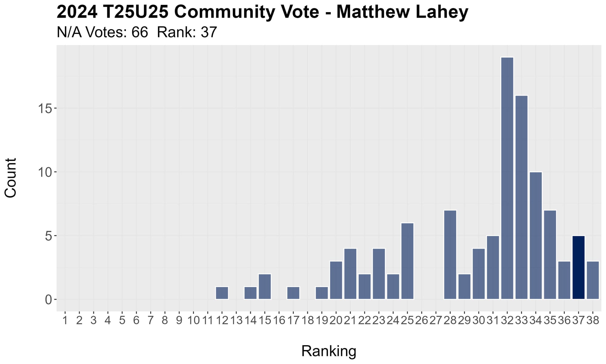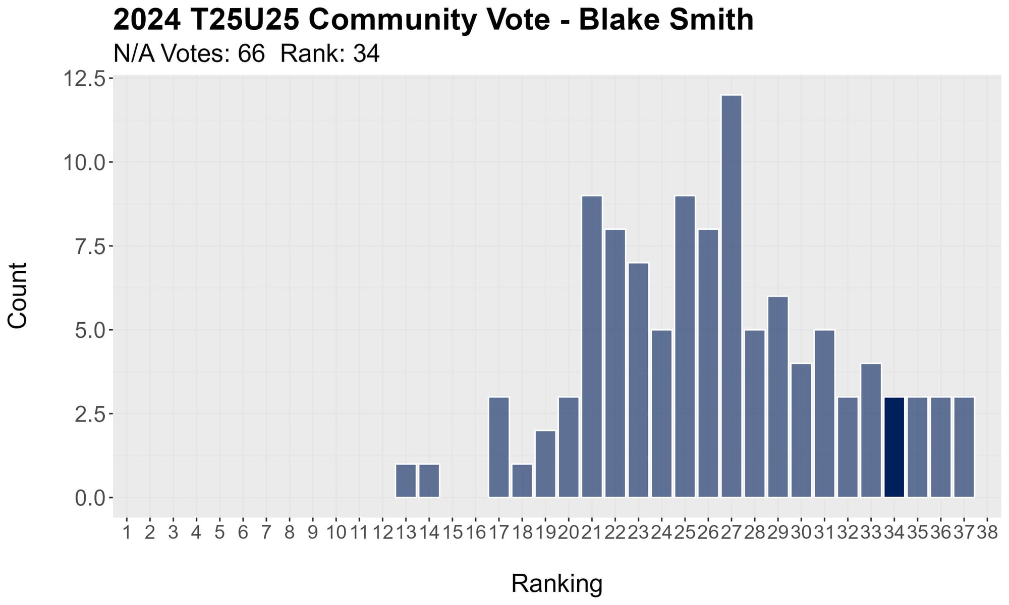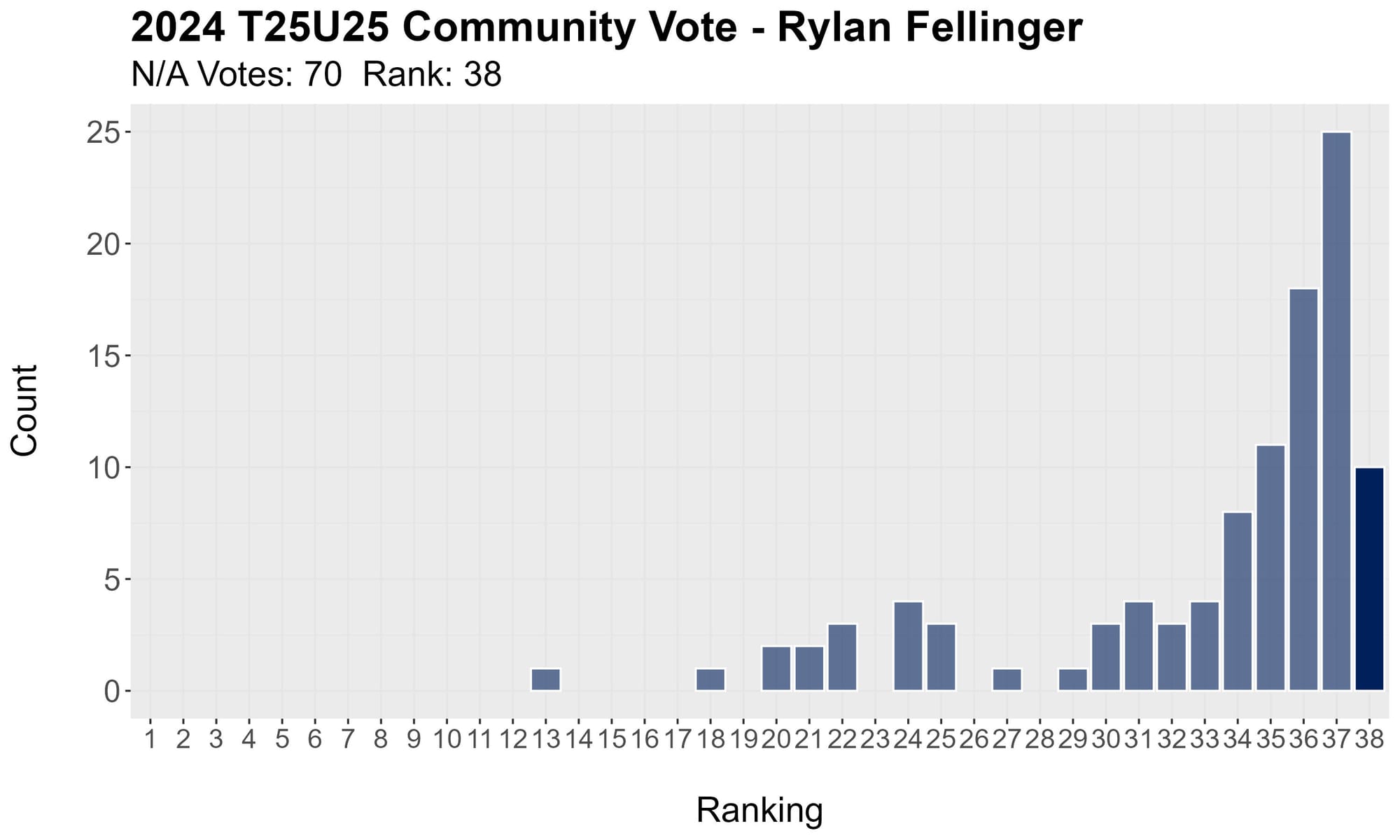 If absolutely no one ranked a player at all his weighted average would be 26. The closest to that this year was 25.62, so everyone had at least one vote at 25 or more.