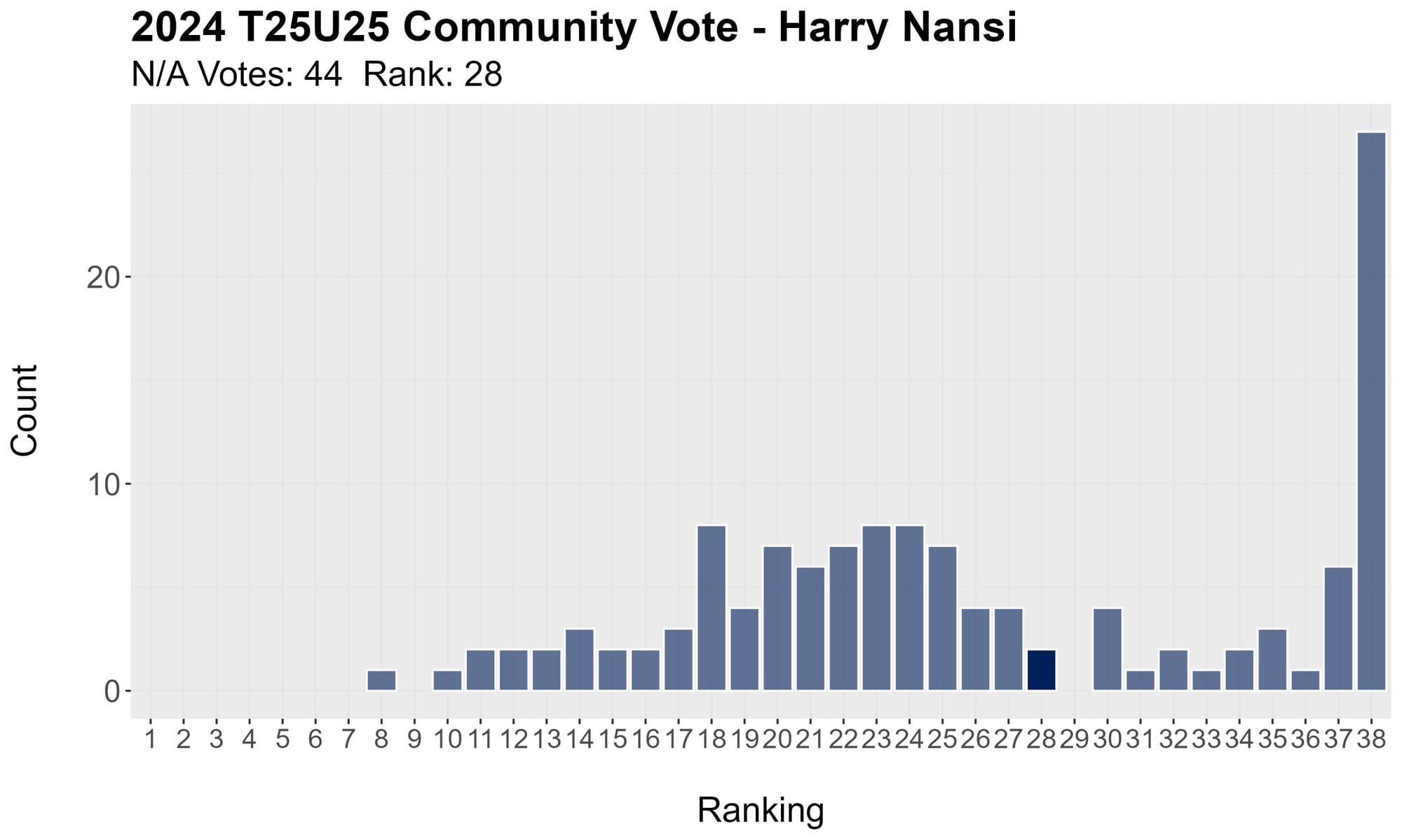 Note the y-axis. Nansi also had a lot of people who left him last. In his case, as the youngest player on the list, he started out in spot 38, so a lot of people just left him there.
