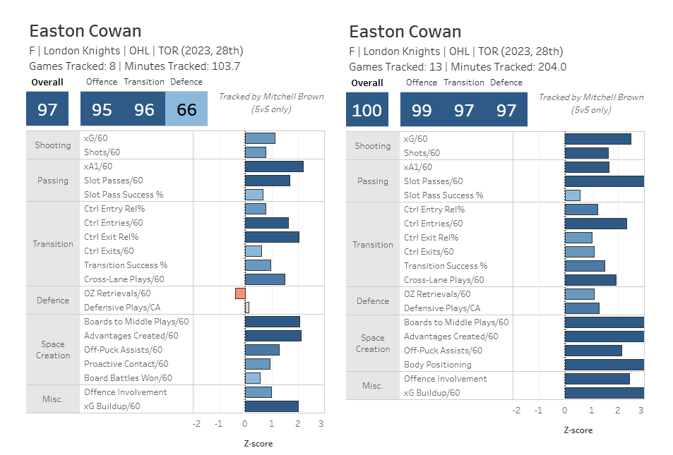 Brigstew: I think the hype cooled around Cowan a bit because of the World Juniors, and because his production fell off from the previous season. I think the problem is that he seemed to very much be trying to learn the details he was told he needed to be a pro, and he is so good he could try and play differently in junior and still be a top player while he was experimenting and learning on the fly. He went from being more of a pure playmaker who could score the occasional goal, to becoming more of a sniper/finisher, and his shot got a lot better. All of the drop in his points came from assists, his goal per game rate was about the same. And then at the end of the year, he turned into an absolute monster. He had 25 goals and 70 points in his last 32 games between the regular season, OHL playoffs, and Memorial Cup. He set franchise records, in one of the top franchises in the CHL, for his performances. He is one of the top producing players in OHL playoff history. I don’t think he’ll ever be a super star in the NHL, but he should be the next best prospect in a long time to come through Toronto’s system, only after Matthew Knies.