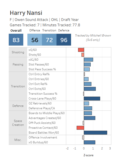 Nansi has spent the first two seasons as a right winger for Owen Sound, but I expect to see him play some centre at some point soon because he has the mindset of a centre on the ice. What I mean by that is he's a very good puck distributer, he sees the game extremely well, and he's got great hands for someone so lanky.