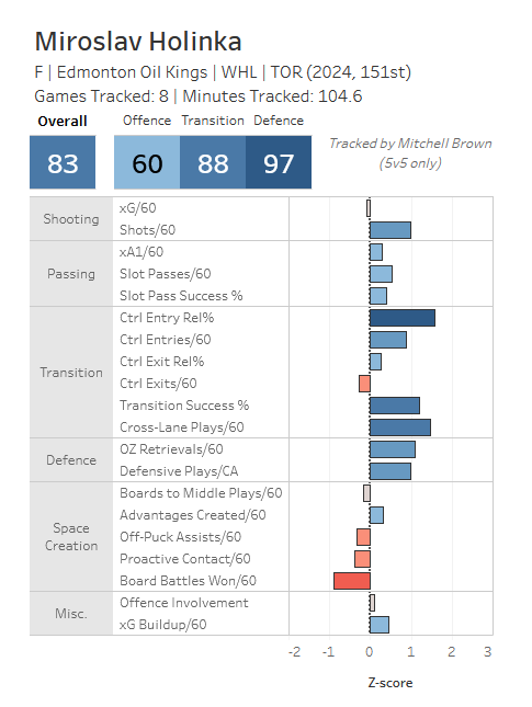 Now, about those points. I noticed pretty early on that his production was pretty firmly tied to his usage. At the start of the year, he was cut from Toronto's camp early and was given top usage, both at even strength and on the powerplay. Once a couple of Edmonton's top players in NHL camps were returned, namely Gracyn Sawchyn, Holinka was bumped to the 3rd line (2nd at best, sometimes) and 2nd powerplay unit. That's the role where he really leaned on his defensive game, rather than pushing for offense. In the times after where Sawchyn was hurt, Holinka would get bumped back up to the top line and top powerplay unit and the points would come in more often again.