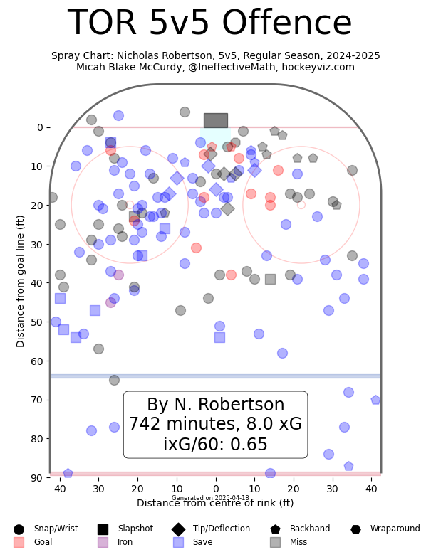 My bottom line with Robertson is that he is never going to morph into a top-six asset. He might get used on a third line in the way players do where, when you look up their ice time halfway through the season, you discover they play less than most of the fourth line. He will likely score some goals, and likely not at the same rate as the year before last – the season juicing his career stats a little – but he'll score. No one else will shoot or score very much until he goes and sits down. (This is also fairly true for Auston Matthews, but with him it's a feature, not a bug.)
