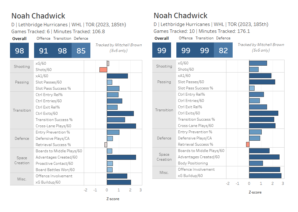 This is the last two seasons, and is limited minutes in each. It's not enough time to say with confidence that we know the player, but it's enough, particularly in the more recent season, to see what type of player he is. It's not a shock that Chadwick is better offensively than defensively – it's points that get a player attention, and Chadwick has garnered a lot of attention from prospect-minded Leafs fans for his goal scoring and overall offensive play. What is something to note is that, at age 20 in the WHL, his defence has not improved in a way obvious enough to get noted in 10 games of tracking.