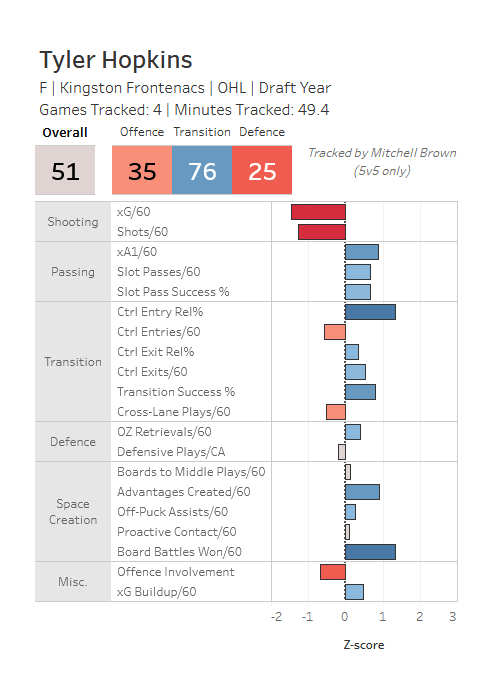 Overall, I think Hopkins is a good pick relative to his draft position, and with a good likelihood of reaching the NHL than a lot of prospects taken after the first round based on his current array strengths. I think the reason why he wasn’t taken in the first round is a lack of high-end dynamic plays coupled with icetime. There’s a world where he blossoms into a top-six NHLer by gaining game-breaking skills, but less that there's a good chance he becomes a third or fourth line centre in the NHL. Comparing him to other prospects, he's not very far off from Fraser Minten, has more runway than Luke Haymes, and is already better than Miroslav Holinka two years sooner.