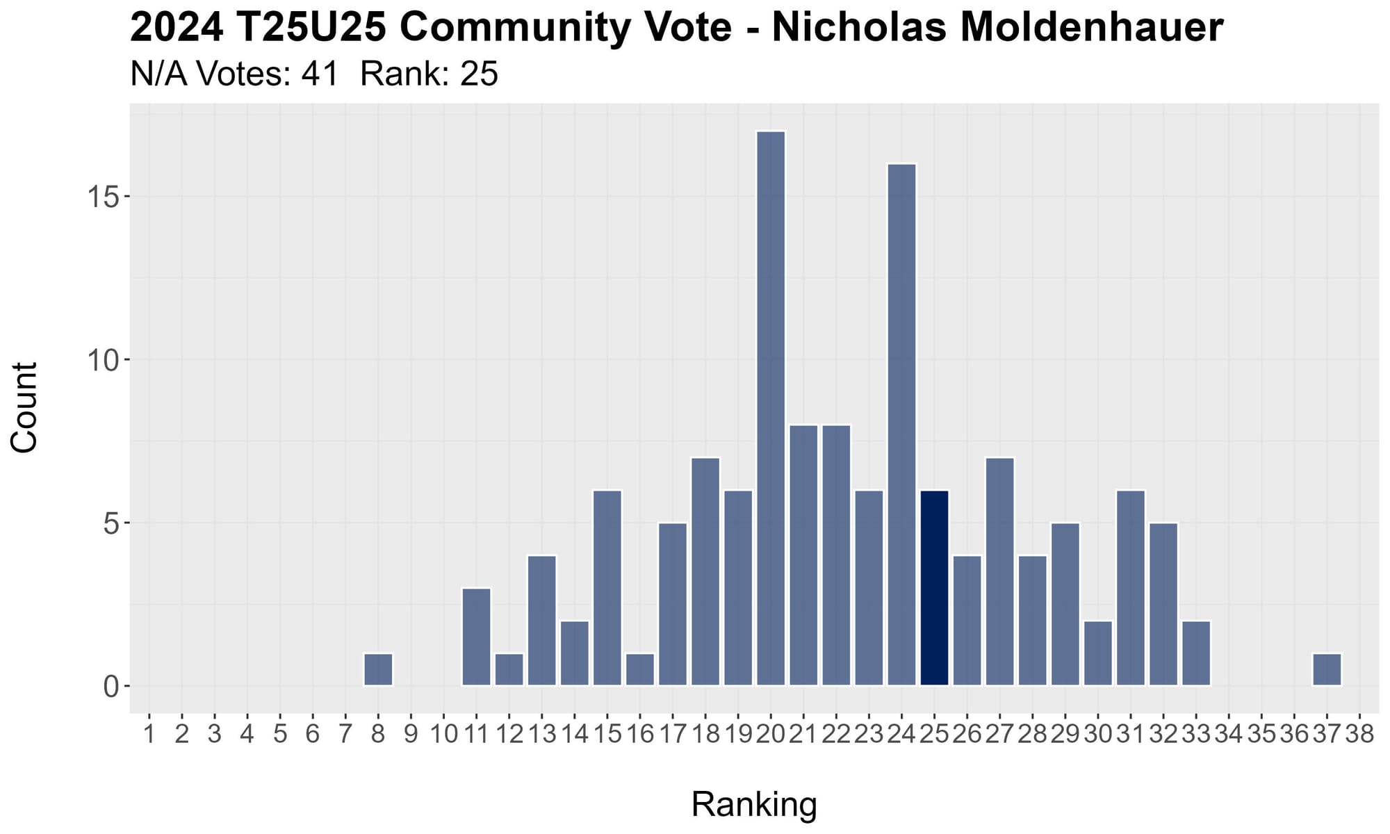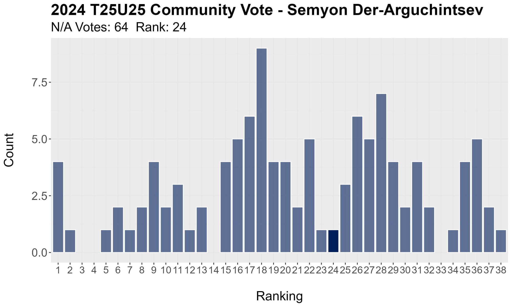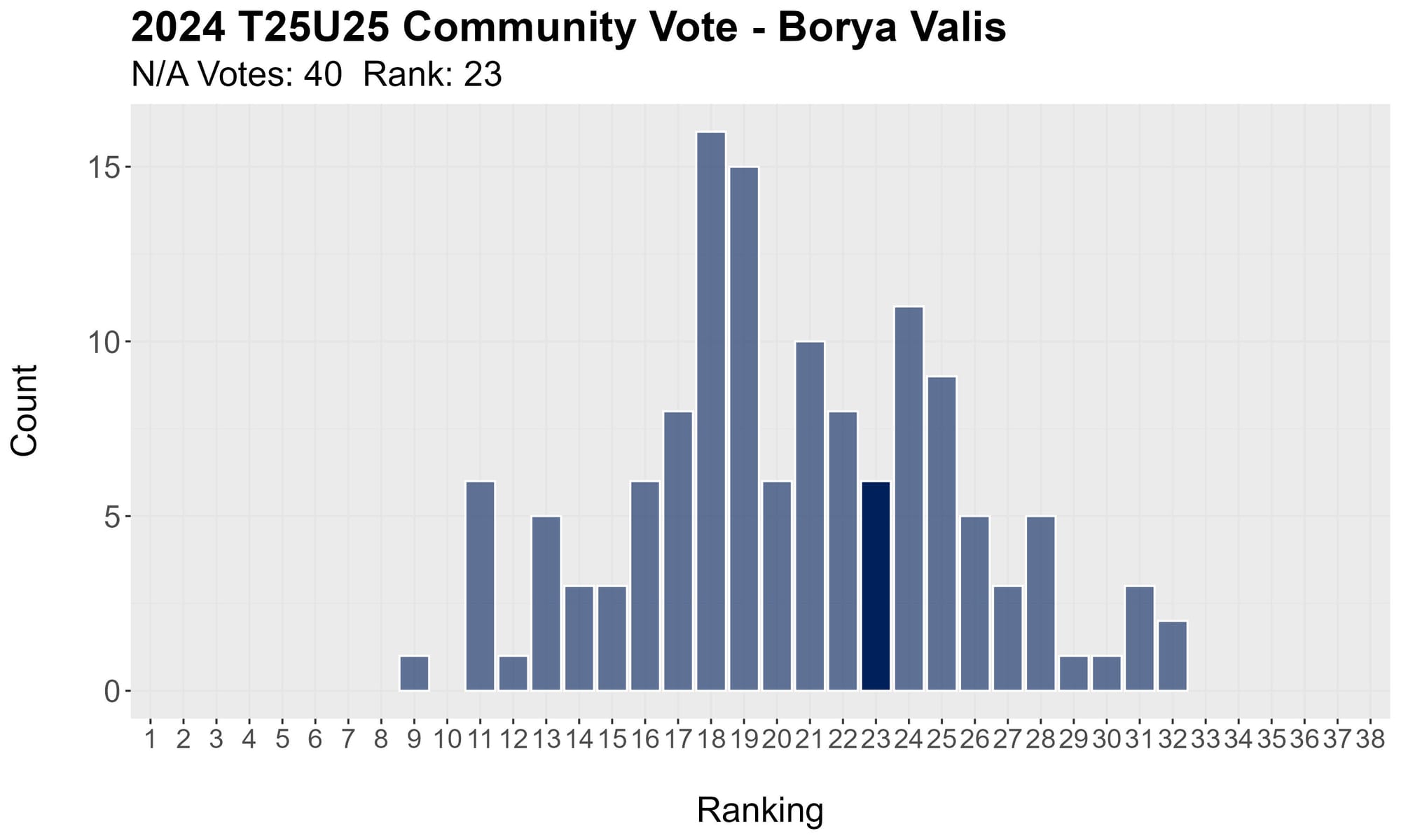 The 25th ranked player is a draftee from 2022 who hasn't yet appeared on the Official Vote. His weighted average ranking is 22.54, and as mentioned last week is barely higher than the 26th ranked Sam McCue.