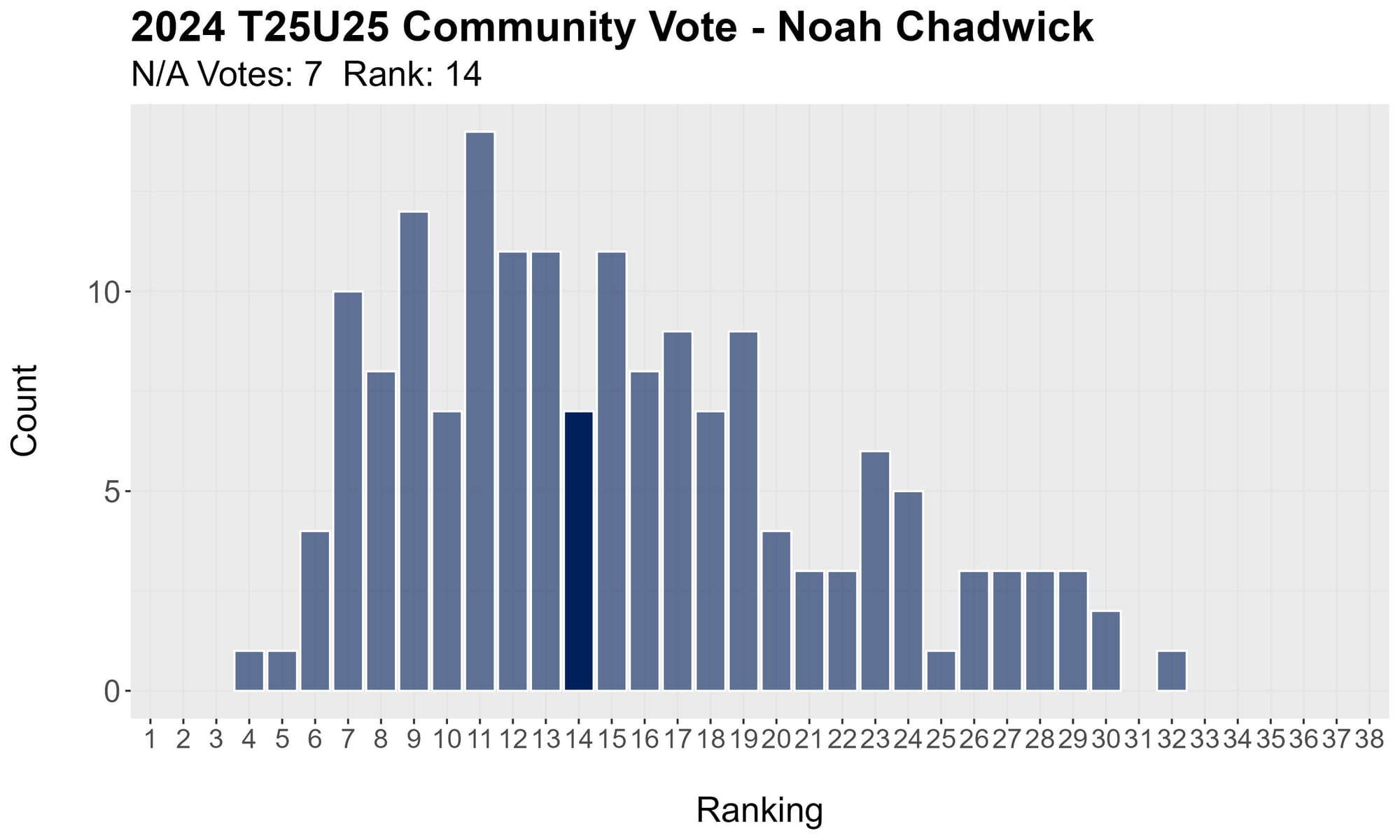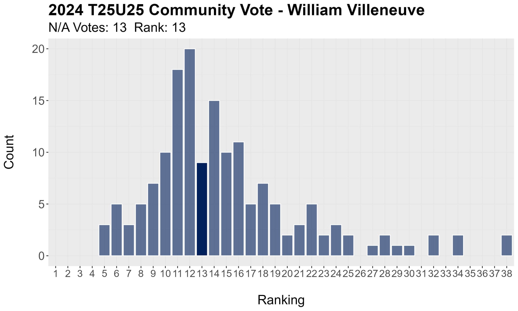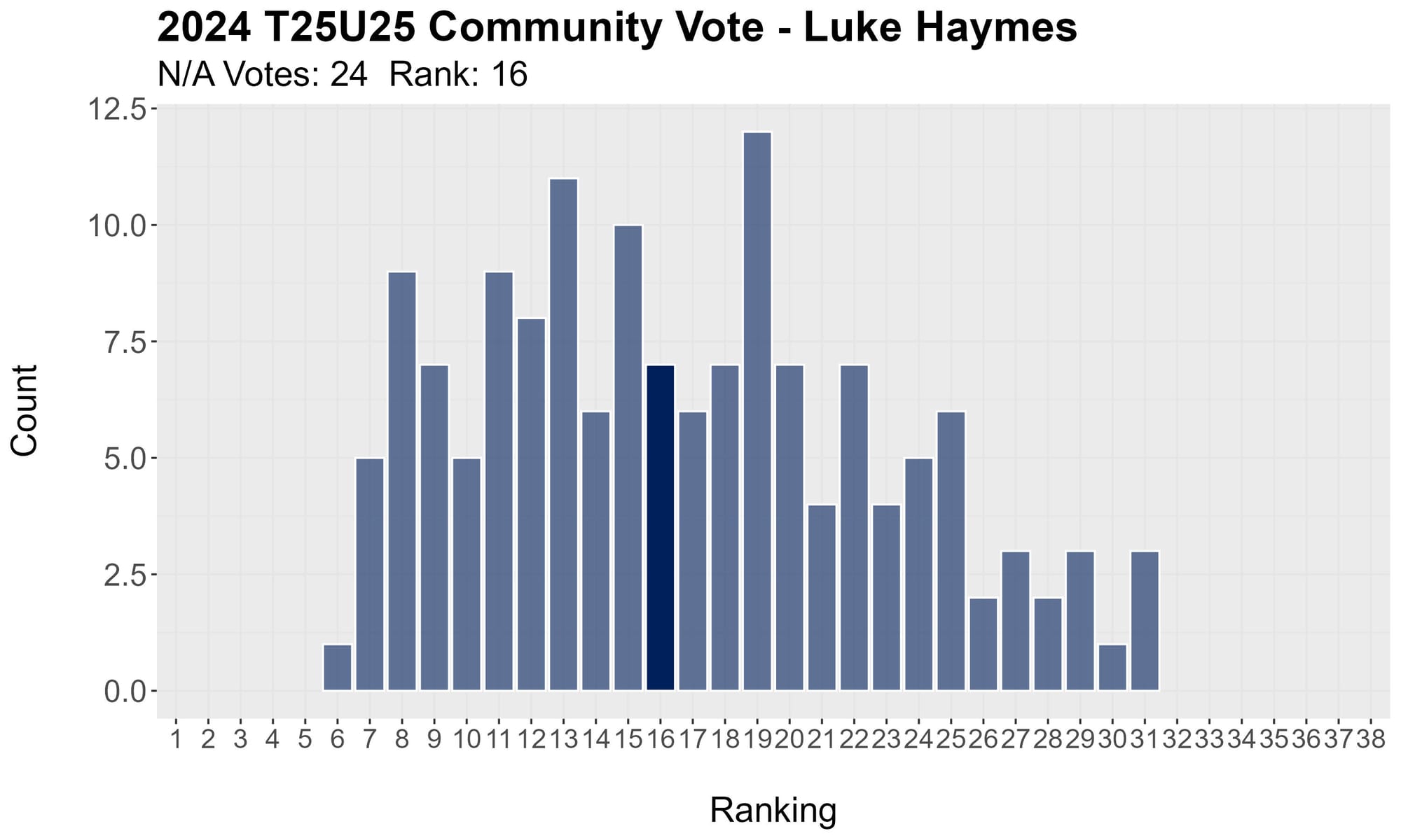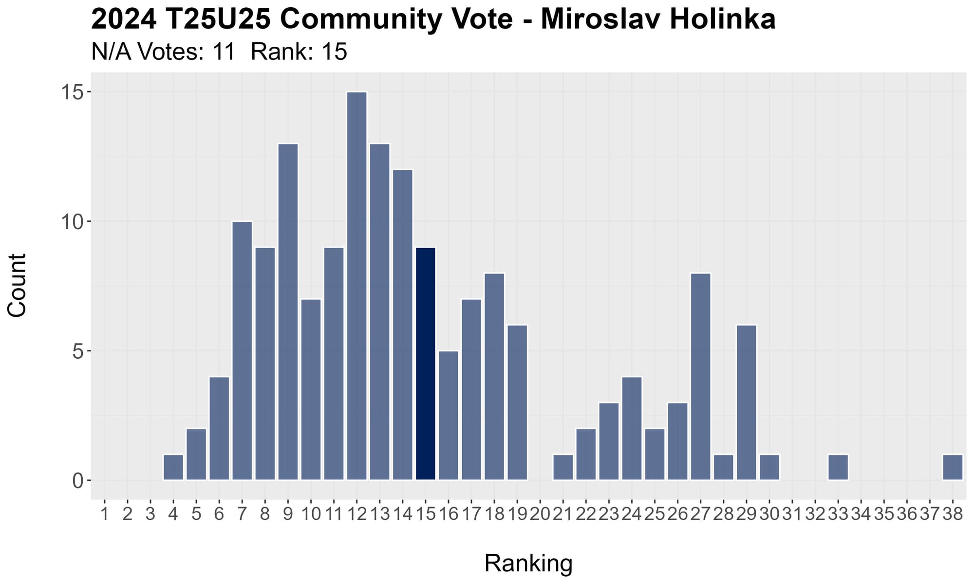 Also in a very similar spot on both lists, Holinka is over two ranking points above Haymes at 15.44. This jump is similar to the one on the official list, but there are two more to come in the Community Vote, with much tighter clumping up of votes in between.