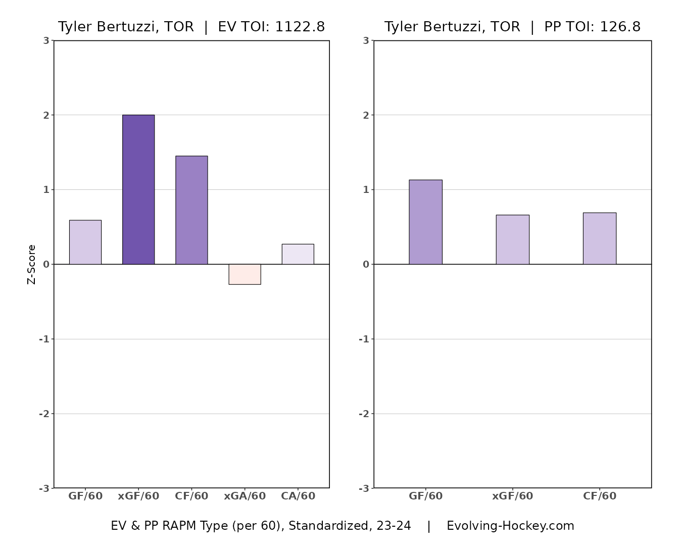 Bertuzzi was developed in Detroit as a prospect who worked his way up out of the bottom six. His results improved dramatically after he missed almost all of 2020-2021 with an injury. He came back to play on Detroit's top line, and continued playing with the best players on Boston and Toronto. The major improvement came in his offensive impact as measured by either HockeyViz or Evolving Hockey. His defensive impact has always been at least okay for a winger, but it got better too.