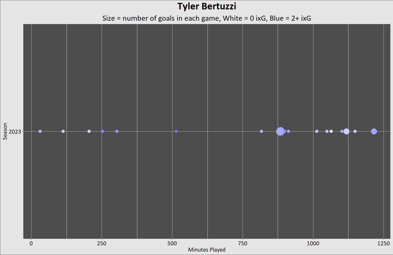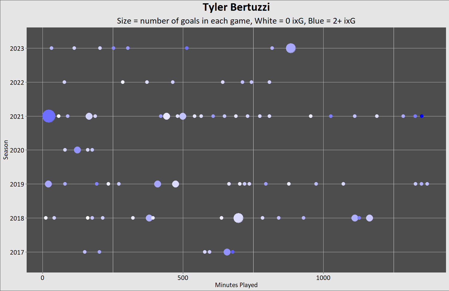 Bertuzzi's personal shooting looks good by Expected Goals. He shoots very close to the net, and like most things about his game, it was better in Toronto than ever before.