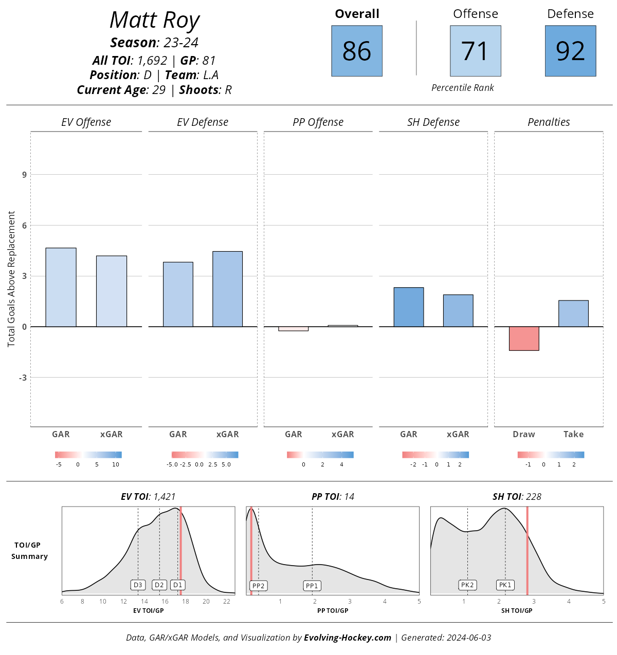 They have a 1RD in Drew Doughty, the second-highest paid defenceman in the NHL by cap %, and his presence has always created an artificial cap on Roy's usage, but also implies a caveat on his results since he's insulated by that star number one defender. LA has put their trust and money into Mikey Anderson and Vladislav Gavrikov as young left-shooters. But they have Brandt Clarke coming on as well who shoots right. LA has a decision to make about term with Roy that could force him to look for a different team.