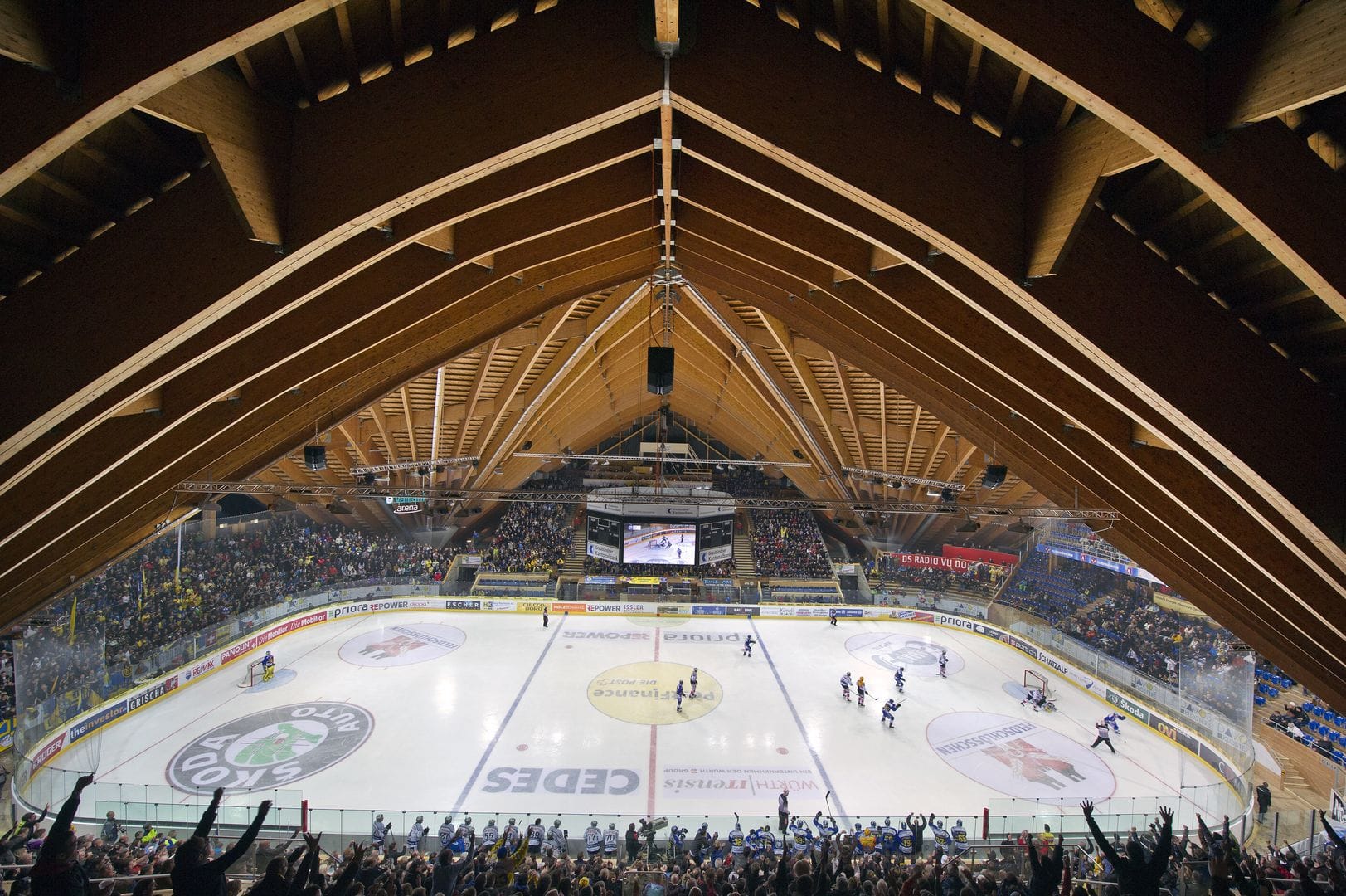 Such a beautiful place. Nestled in the Swiss alps. All that gorgeous wood. It's a beautiful town, a beautiful arena, and the referees are dressed as cows.