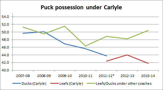 Carlyle coached hockey teams, when measured by puck possession metrics, have been on a six-year slide. So is the issue at hand really that Leafs players are a delusional bunch, believing themselves to possess greater talents than reality would suggest? Or is perhaps coaching the issue? Given the evidence, you'd have to be delusional to think otherwise.