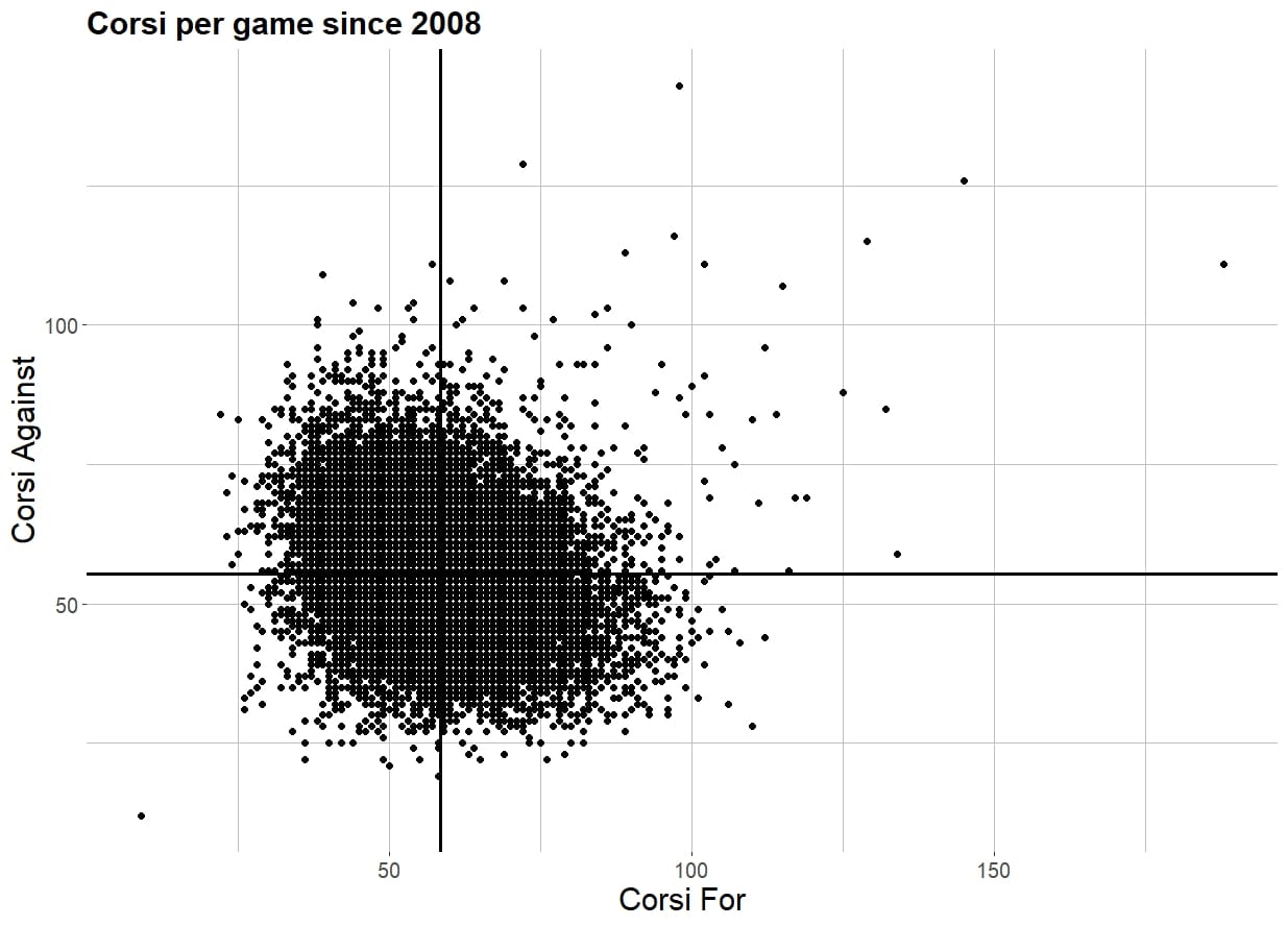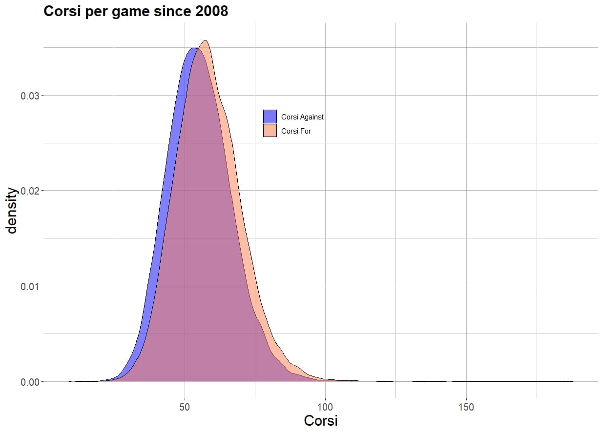 Next, we need the distribution of Corsi per game, so see how much it varies.