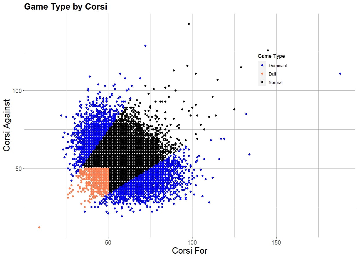 I thought it over, and these were my arbitrary decisions. A game where the Corsi % is at least 60 is a dominant game. A game where both teams are below 50 in Corsi is a dull game. I picked 50 as it's a nice round number near the 25th percentile on both Corsi For and Against.