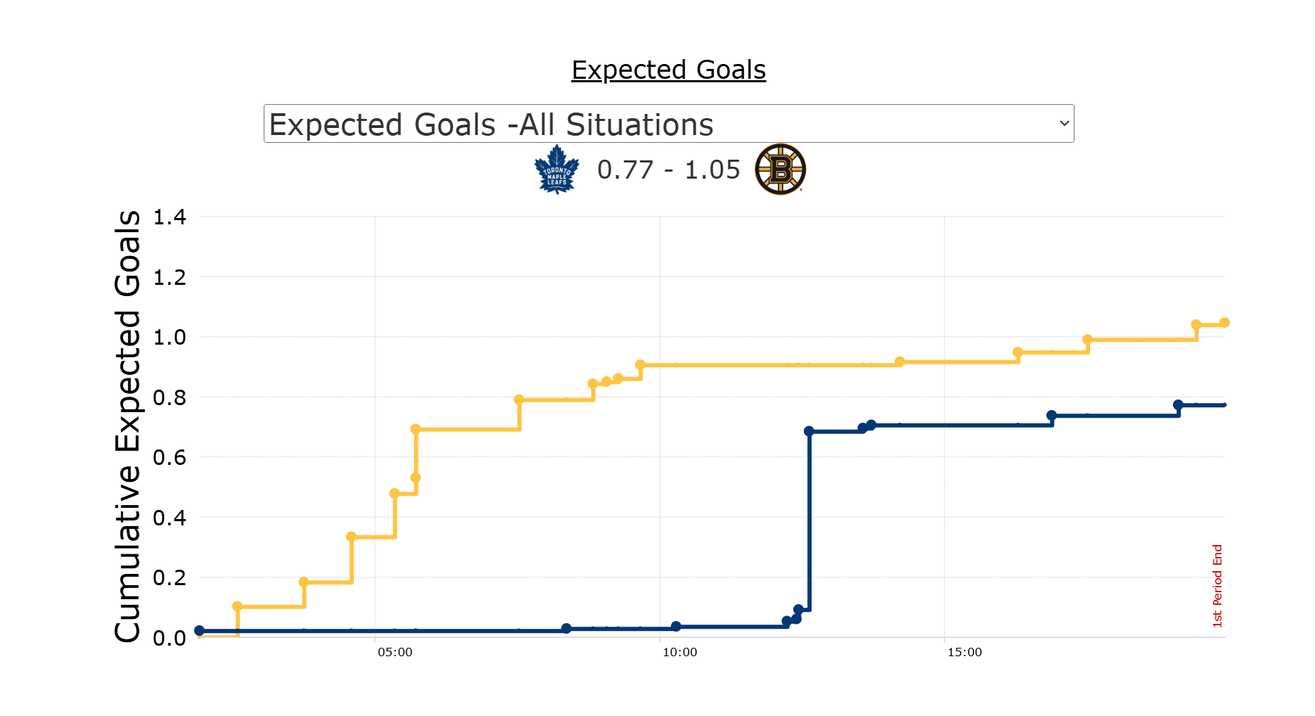 So was that a good period? Not really. If you like that Expected Goals model most people use where a Shot on Goal counts as one and everything else is zero, then the Bruins ran away with it.