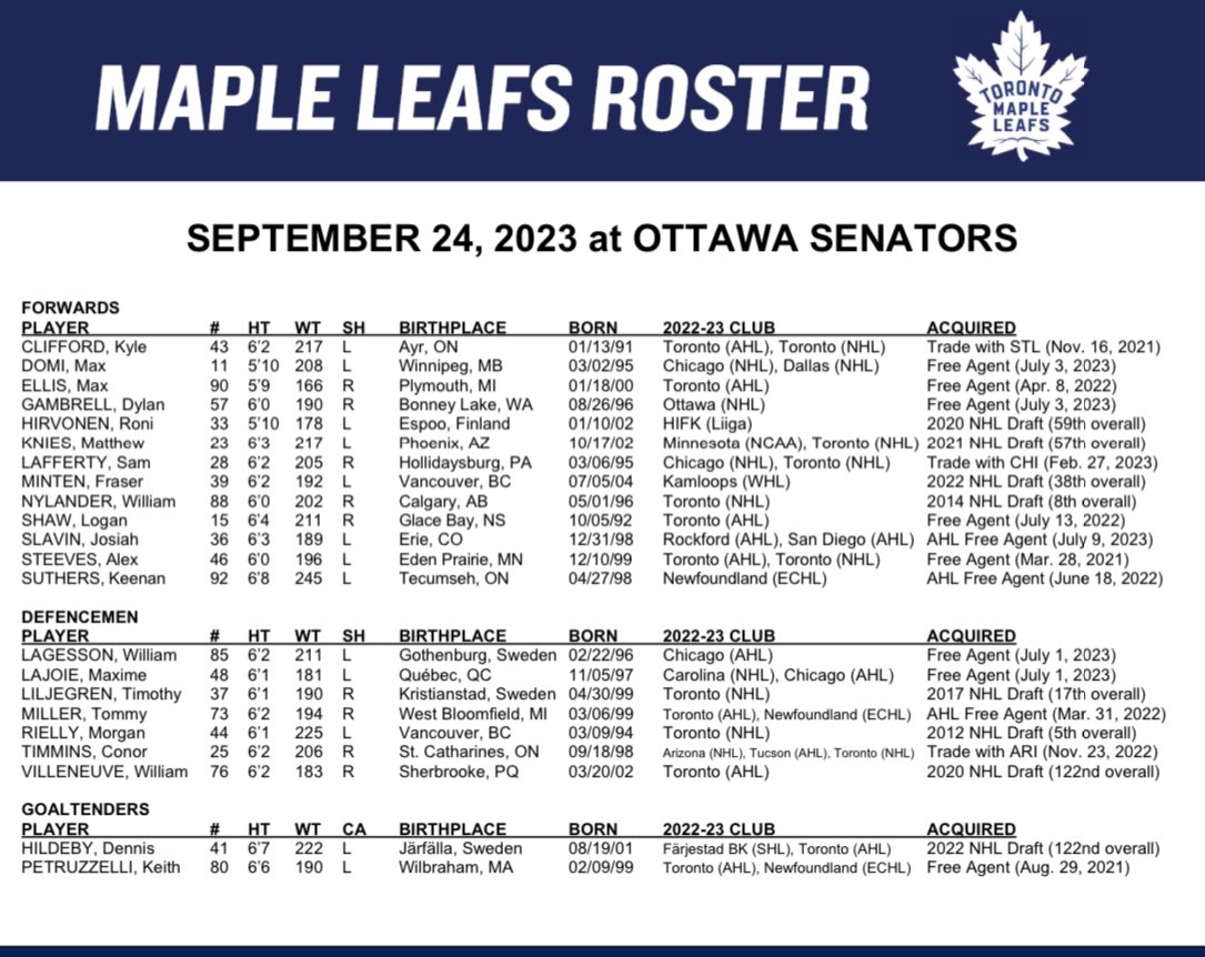 Well, that sure is a preseason lineup, and I struggled a lot with the forwards. I'm also reasonably sure I got the required eight veterans (you should not be sure I even got the right guys, clearly). The Leafs might choose to have Cowan (counts as a veteran so is in for sure) centre his own line or play at wing – he did both at Traverse City.