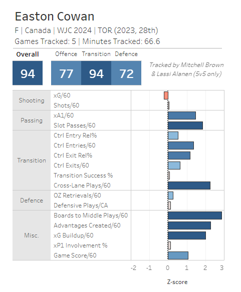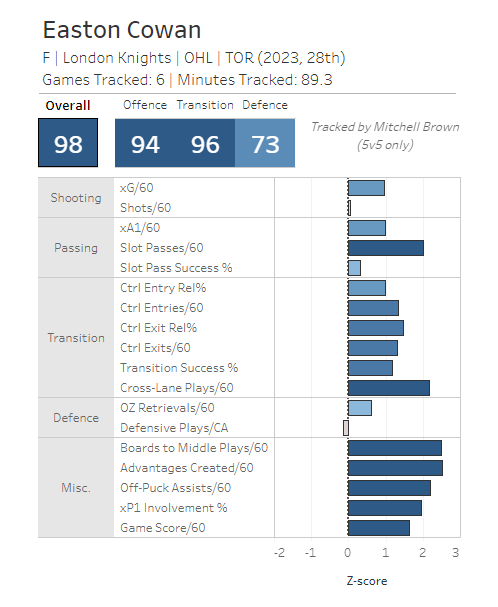 On the other hand, it's not like Cowan is a points-only guy. He gets his points because he earns them, even if they're secondary assists. He does all the things that helps his team create and capitalize on scoring chances. This is something you can see when you watch him play, but it also shows up in his tracking data where he profiles as one of the OHL's top forwards.