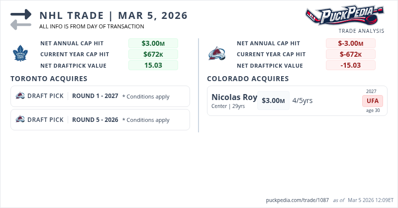 The Maple Leafs made their first trade of the 2026 deadline period, sending Nic Roy to Colorado.
