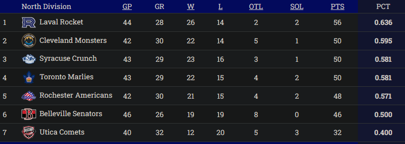 The Marlies are now tied for third, though the tie-breaker goes to the Crunch. Every team is now in a chess game in the standings, with each division match-up meaning more and more with less than 30 games left in the season for most teams. The Rochester Americans are right on their heels and the Marlies don't want to once again drop into that play-in round used by the AHL.