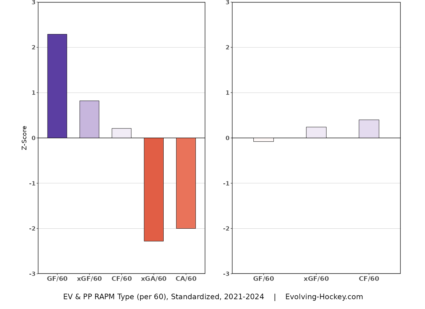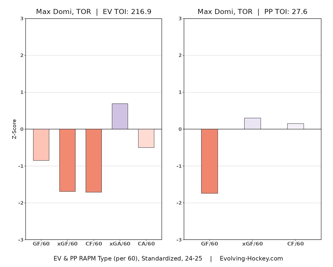 On-Ice Impacts: Domi has a career history of a modest positive impact offensively and a negative defensive impact of a larger amount. He has not been a massive ball of negativity on defence beyond his 22-23 season on Chicago where massive negativity was their team style.