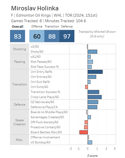 Holinka's season was interesting. He didn't have a big offensive explosion like I would have expected for an older D+1 player, but he emerged as a very strong two-way center. He played as a middle six center for Edmonton and got heavier defensive usage than their top offensive line. But his impacts were excellent, especially on transitions and defense. A good chunk of his offense came from the powerplay, where he was also very strong because of his passing and the threat of his shot.