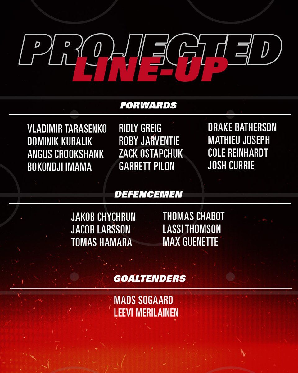The Sens are playing newly acquired Vladimir Tarasenko for the first time. They are also featuring Mathieu Joseph, who they seem fairly desperate to trade to make cap space. The rest of their forward lineup is mostly AHLers.