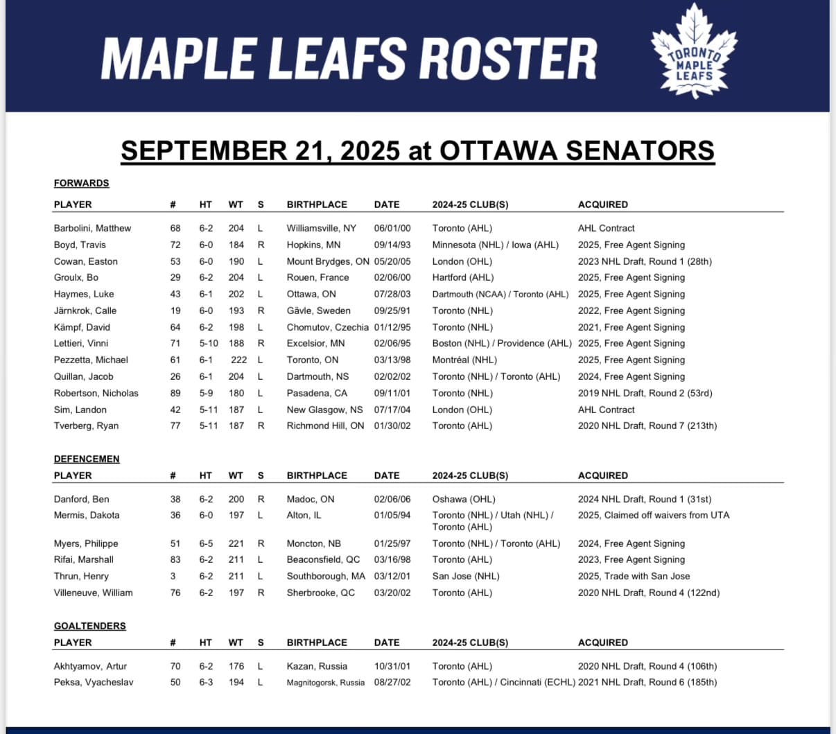 The Sens listed their lines: