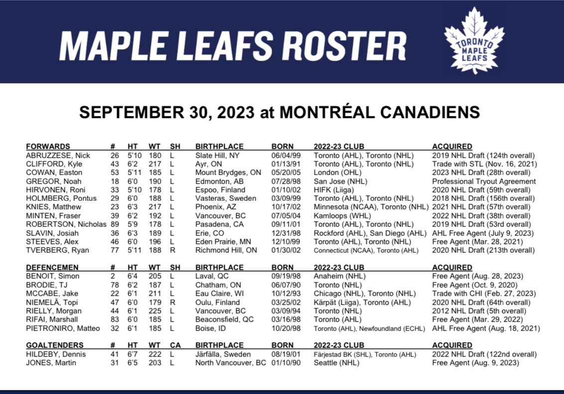 So the choice to put with Holmberg is likely Robertson. Knies and Minten need a winger, and they might get Tverberg or Easton Cowan, but Cowan is more likely to centre a fourth line with Clifford and Slavin, Steeves or Abruzzese. That leaves a third line of Hirvonen and whoever is left.
