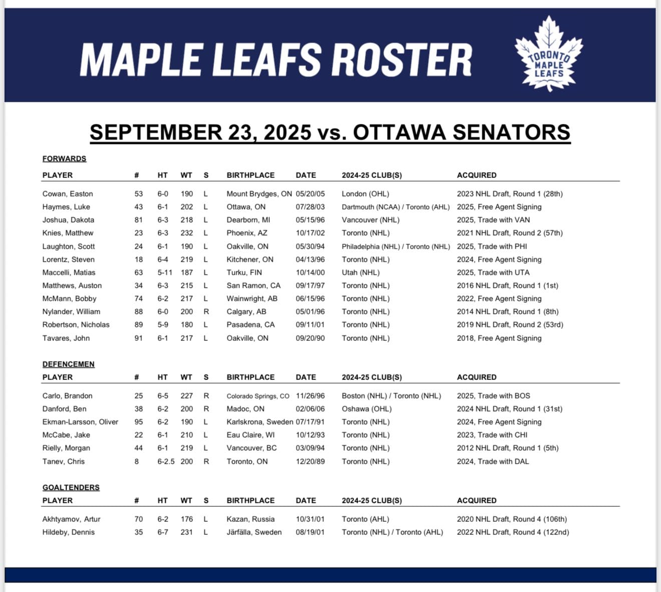 With Nick Robertson and Easton Cowan on the playing roster again, they could have been played together, but the structure is a little different. Cowan has practiced some with the Tavares line as well.