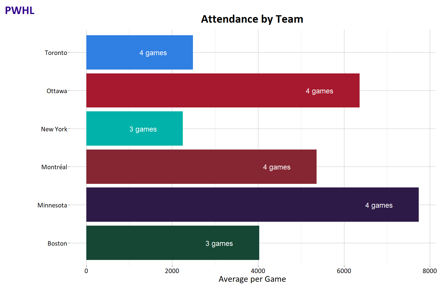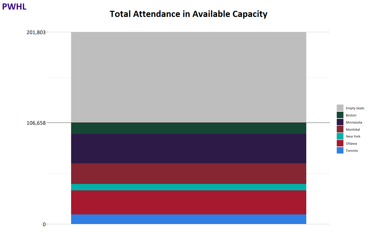 Toronto shows some very small numbers of empty seats although they are sold out entirely. When New York plays in the big rink, they don't fill it up like Minnesota does. Montréal is bringing out a lot of fans to either venue on opposite sides of the island, but they can easily fill the bigger Laval arena. Boston and Minnesota are building on the NCAA tradition in their areas.