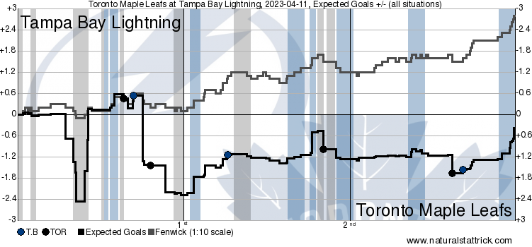 The shorthanded Leafs, who were running only 17 skaters (and Conor Timmins at forward) got run into the ground by the Lightning's top forward unit. Point's line was 18-3 at 5v5. The silver lining is the Leafs didn't have their first line to counter. We'll see how things change when the playoffs actually start. It's astounding that the Leafs won the game despite the advantages the Lightning had. It should be a big source of confidence in the Buds that they can win even not on their best night. They can do this.